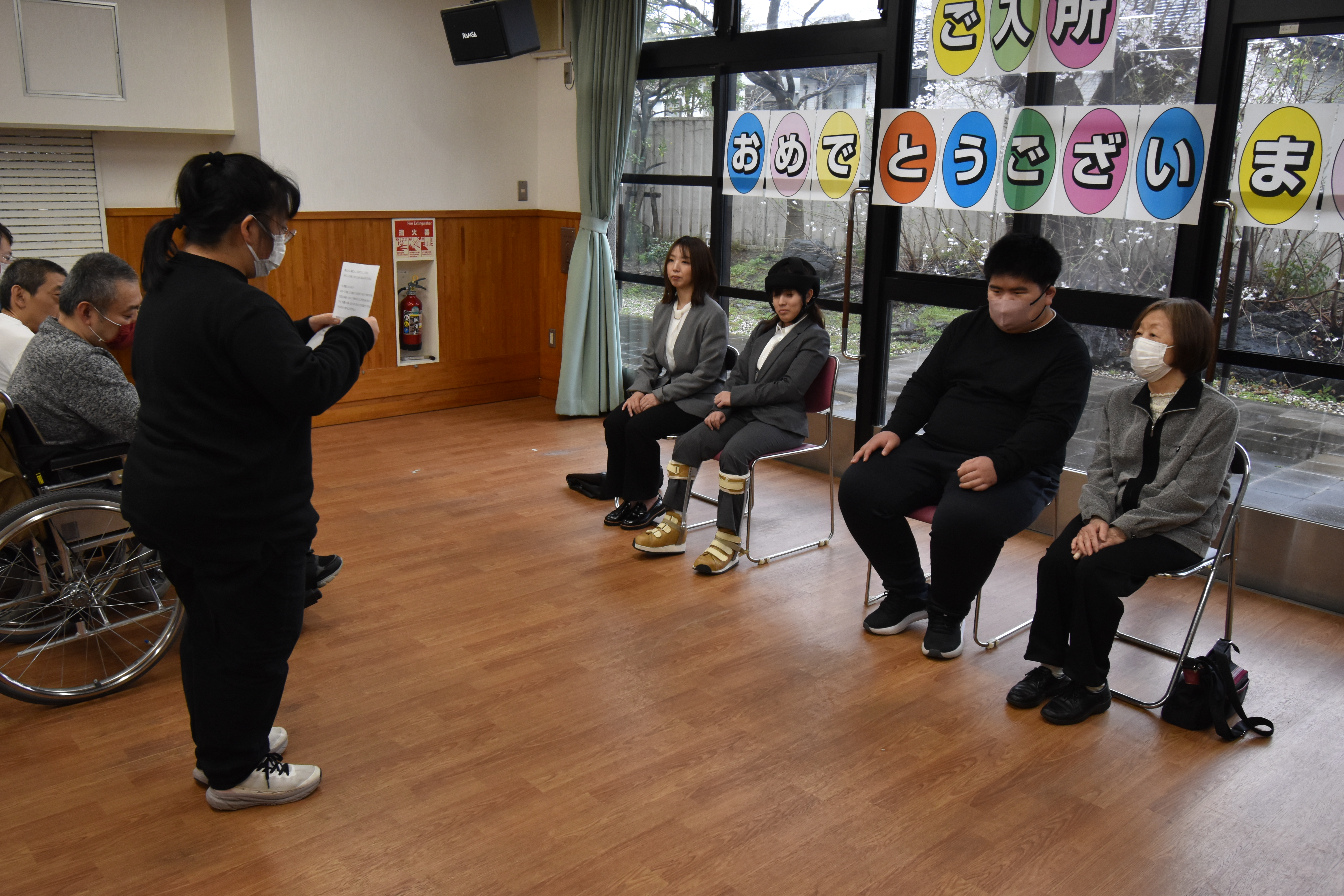 1/30(火)コロナが第5類に移行してから初となる新年会を開催しました。 約4年ぶりの新年会となりましたが、今年はちょうど二十歳を迎える利用者さんが 2名おり、二十歳を祝う会も同時に開催させていただきました。 先輩利用者からのメッセージと記念品の贈呈、2名の利用者さんからはそれぞれ今後の 展望を力強く話してくださいました。 また後半はカラオケ大会とプレゼント抽選会を行い、大変盛り上がりました。 今年もどうぞよろしくお願いいたします。