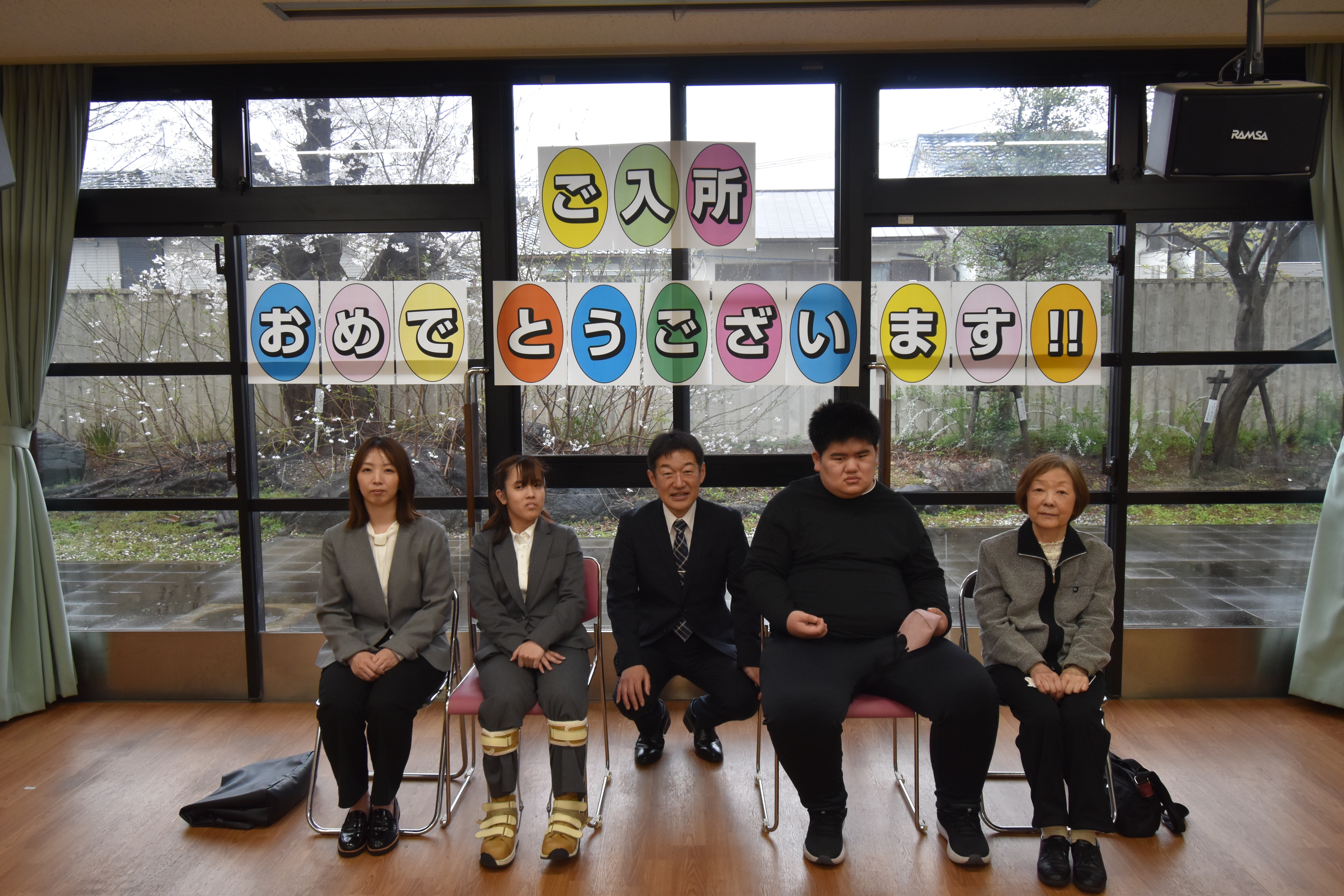 本日より、新たに二名のご利用者様をお迎え致しました。 それに伴い、入所式を執りおこないました。 当日はあいにくの雨となりましたが、皆様からの暖かい拍手に迎えられ、お二人とも嬉しそうなご様子でした。 新しい仲間を迎え、より一層賑やかなスタートとなりました。 今後ともどうぞ宜しく御願い致します。