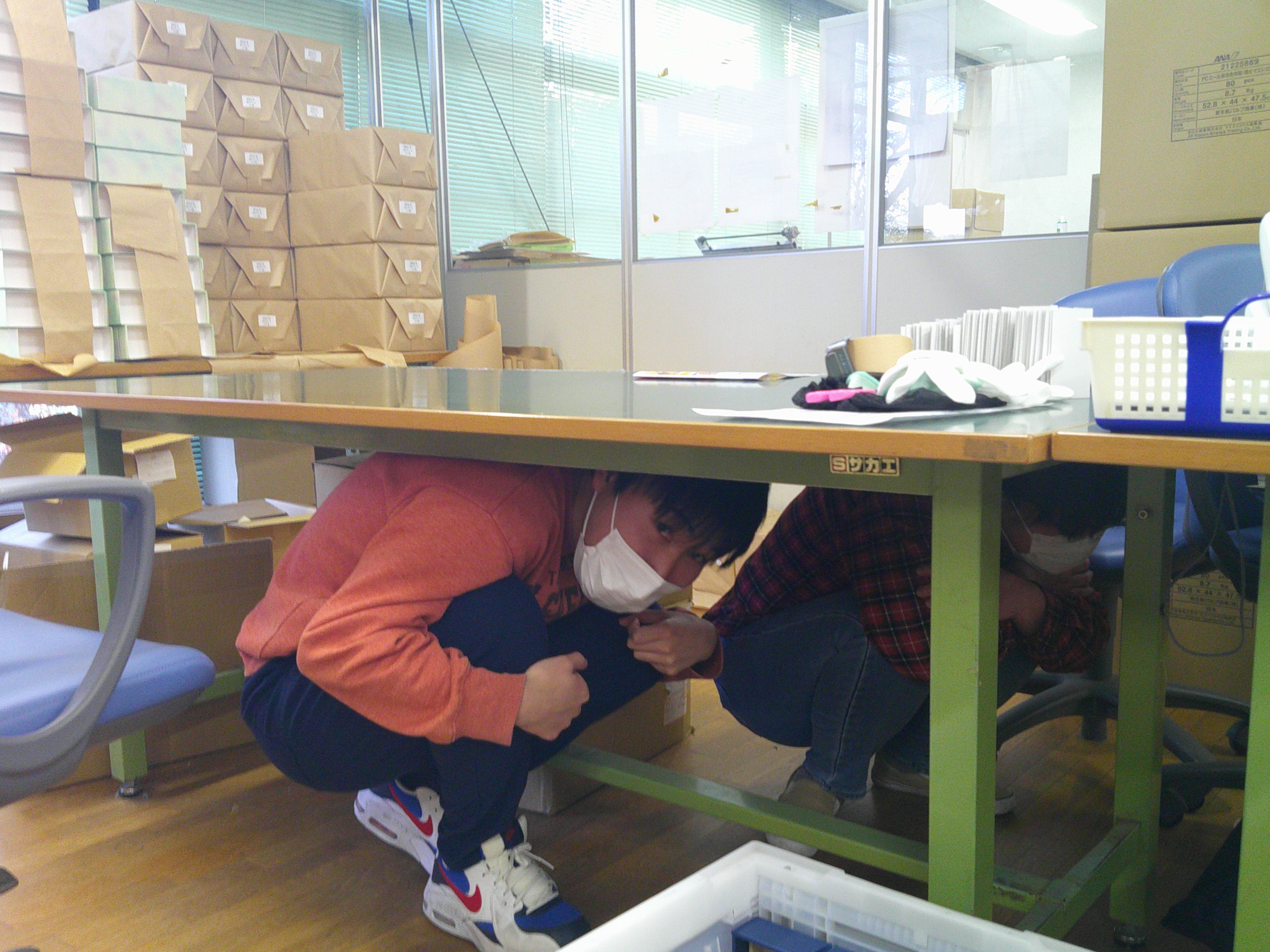 シェイクアウト訓練を実施しました。 地震発生を想定し「まず低く、頭を守り、動かない」という基本行動を確認しました。 物が落ちてくる状況を想定し、クッションで頭を守ったり、机の下に身を隠したりと実践的な訓練を行いました。 日ごろから備えることの大切さを改めて感じる機会となりました。 今後も継続して防災意識の向上に努めてまいります。